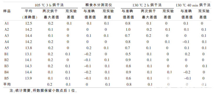 經過試驗記錄數據計算, 得出每個樣品的水分數據,匯總統計結果見表 1,誤差分析見表 2。