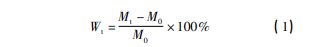 利用恒溫恒濕箱,使面板復合材料、PMI 泡沫 和 PMI 泡沫夾層結構復合材料試樣在相應環境 中持續吸濕。在吸濕的前 24 h,每 12 h 對其吸濕 率 Wt 進行測試; 24 h 后,每 24 h 對吸濕率 Wt 進 行測試。本文使用稱量法表征試樣的吸濕率 Wt ( 見式 1) 。