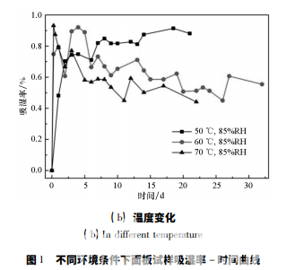圖 1 為面板復合材料試樣在不同吸濕環境中 的吸濕率 - 時間曲線。從圖中可見,五種吸濕環 境中,面板復合材料的大部分吸濕都集中在吸濕 初期的 24 h 內,即吸濕初期吸濕率快速增加,隨 后吸濕率有所波動,最終都到達平衡。不同濕度 環境中( 見圖 1( a) ) ,面板復合材料的吸濕行為 相差很大,環境的濕度越大,試樣的吸濕速率和飽 和吸濕率也越大,85% RH、95% RH 和浸水三種濕 度下面板的飽和吸濕率分別為 0. 57% 、1. 18% 、 2. 36% 。同時發現,在高濕度環境 85% RH、95% RH 中,面板復合材料的吸濕率波動較小,而浸水 環境中面板復合材料的吸濕率有明顯的下降,這 是由于浸水環境更為惡劣,浸水對面板復合材料 的損傷更大,使試樣表面溶解和剝落等質量損失 的程度和范圍大于高濕度環境,且面板復合材料 本身質量較小,在吸濕率曲線上表現為吸濕率顯 著下降。不同溫度環境中( 見圖 1 ( b) ) ,面板復 合材料的吸濕率曲線更加相近,吸濕速率沒有明 顯的規律,吸濕后期都有部分波動,其中 70 ℃ 時 面板復合材料的吸濕率下降最多,其次為 60 ℃環 境下的,50 ℃ 環境下試樣的吸濕率穩定上升,沒 有明顯的下降過程。這可能是因為環境溫度越 高,吸濕過程中材料的剝離、脫粘等不可逆損失越 多。最終50 ℃、60 ℃、70 ℃三種環境中面板復合 材料 的 飽 和 吸 濕 率分別為 0. 85% 、0. 57% 、 0. 51% ,三個飽和吸濕率較為接近。與環境溫度 相比,濕度對面板復合材料吸濕行為的影響更大。