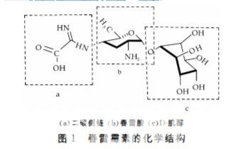 春雷霉素(Kasugamycin)又名春日霉素?加收米?加瑞農(nóng)等,是由春日鏈霉菌(Streptomyceska-sugaensis)所產(chǎn)生的一種氨基糖苷類抗生素.春雷霉素作為農(nóng)用殺菌劑,被廣泛應用于農(nóng)業(yè)生產(chǎn),不僅具有較好的防治植物疾病的效果,并且對人畜無毒害作用,無污染和無殘留符合現(xiàn)代環(huán)保要求,是目前最具推廣前景的綠色農(nóng)藥之一,也是當前農(nóng)作物病蟲害防治中具有廣闊發(fā)展前景的農(nóng)藥之一.春雷霉素的結(jié)構(gòu)由春雷胺(Kasugamine)?D-肌醇(D-inositol)和二碳側(cè)鏈(Two-carbonsidechain)共三部分組成,如圖1所示。