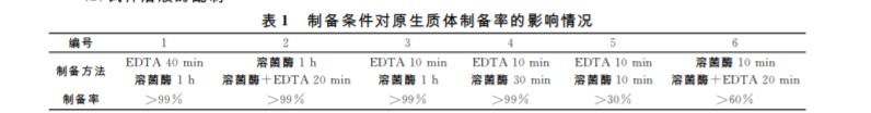 基因組shuffling過程中的關(guān)鍵步驟在于原生 質(zhì)體制備與再生,本實驗中首先確定了制備和再生的培養(yǎng)基的種類?方法和滲透壓穩(wěn)定劑.另外酶解 的溫度?時間和酶解前預處理的因素見表1所示. 結(jié)果表明,在制備原生質(zhì)體時,EDTA 預處理細胞 可以提高細胞壁酶解的效率.通過實驗結(jié)果,本文 最終選擇的滲透壓穩(wěn)定劑為0.3mol/L的甘露醇, EDTA 預處理10min,酶解時間30min,原生質(zhì)體 再生采用自然擴展法。