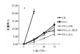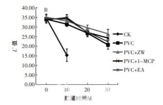 3) 聚氯乙烯+紫外照射組(PVC + ZW 組),在 PVC 膜包裹 的條件下,每隔 10 d 紫外照射 1 次,燈管功率為 40W, 強度為 375 μW/cm2 ,時間為 10 min;4)聚氯乙烯+1-甲 基環丙烯組(PVC+1-MCP 組),在 PVC 膜包裹的條件 下,加入 1 包 1-MCP;5) 聚氯乙烯+乙烯吸收劑組 (PVC + EA 組),在 PVC 膜包裹的條件下,加入 1 包 EA。所有處理組均置于溫度為(1±0.5)℃,濕度為(90± 5)%的冷庫中貯藏,設置 3 次重復,取樣時間分別為 0、10、20 d 和 30 d。