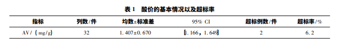 根據(jù)表 1 的結(jié)果,在 32 件實驗樣品中,樣品合 格數(shù)為 30 件,樣品合格率為 93. 8%,不合格樣品的 酸價分別為: 3. 1mg / g 和 3. 2mg / g。