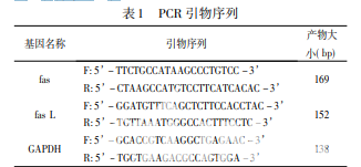 平目湯,由黃芪 30 g,淫羊藿 15 g,川芎 15 g,白芥子 15 g,炙鱉甲 15 g,車前子( 包煎) 30 g 組成,由 上海中醫(yī)藥大學(xué)附屬龍華醫(yī)院中藥房制備成水煎劑( 生藥 含量為 4 g /mL) ,4 ℃保存。 Trizol Reagent,Life Technologies Corporation 公 司; DEPC( RNA 酶抑制劑) ,Sigma - Aldrich - Life Science 公 司; 無水乙醇、75% 乙醇、異丙醇、氯仿、十二烷基硫酸鈉 ( SDS) ,國藥集團化學(xué)試劑有限公司; 逆轉(zhuǎn)錄試劑盒( GoScripTM Reverse Transcription System) ,Promega 公司; 臺盼藍 染液、One cell 細胞計數(shù)板,上海魯汶生物科技有限公司; 引物合成,上海閃晶分子生物科技有限公司; Fas 抗體、Fas L 抗體,美國 abcam 公司; GAPDH 單克隆抗體,美國 CST 公 司; 辣根過氧化物酶標記的二抗,美國 Jackson ImmunoResearch 公司; 生理鹽水,上海長征富民金山制藥有限公司; Protein Marker ( PageRulerTMPlusPrestaind Protein) ,Thermo Fisher Scientific 公司; 蛋白酶抑制劑,Roche Diagnostics 公 司; 微量 BCA 蛋白定量試劑盒,康為世紀公司; 20% SDS solution、Tris - Hcl Buffer( pH 為 6. 8) 、40% 丙烯酰胺( 40% Acr) 、四甲基二乙胺( TEMED) ,BIO - RAD 公司; Tris - Hcl Buffer( pH8. 8) ,北京索萊寶( Solarbio) 科技有限公司; SDS - PAGE 上樣緩沖液( 5 × ) ,碧云天生物技術(shù)研究所; 甘氨 酸( MW75. 07) 、Tween 20,SIGMA - ALDRICH 公司; 氨基 丁三醇( Tris) ( MW121. 14) ,Sigma 公司; 硝酸纖維素膜 ( PVDF 膜) ,Millipore 公司; 麗春紅染色試劑,康為世紀公 司; 脫脂奶粉( 國產(chǎn)伊利牌) ,內(nèi)蒙古伊利實業(yè)集團有限公 司; 顯影劑試劑盒( Immobilon Western 化學(xué)發(fā)光底物) ,Millipore 公司; 胎牛血清,Biowest; DMEM 培養(yǎng)基,上海立菲生 物技術(shù)有限公司( life technologise) ?;蛐蛄型ㄟ^ GenBank 獲得,由上海閃晶分子生物科技有限公司設(shè)計并合 成。引物序列見表 1。