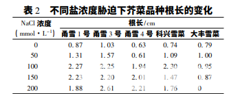 從表 2 可得出,在鹽濃度≤150 mmol·L-1 時,5 個品種的根長相比對照都呈現不同程度的增加。 隨著鹽濃度升高,不同品種的根長表現出不同的變 化規律。其中,甬雪 3 號和甬雪 4 號的根長基本呈 現出隨鹽濃度升高而不斷上升的趨勢,根長的峰值 也都出現在 200 mmol·L-1 鹽濃度處理。甬雪 1 號、 科興雪菜和大豐雪菜的根長則是呈現出先上升后下 降的趨勢。其中,甬雪 1 號和科興雪菜的最大根長 出現在 100 mmol·L-1 鹽濃度處理時,而大豐雪菜 在 50 mmol·L-1 鹽脅迫時根長達到最大值。