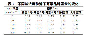 從表 3 可看出,當鹽濃度為 50 mmol·L-1 時, 除甬雪 1 號和科興雪菜外,其余幾個品種的莖長相 比對照沒有明顯變化; 當鹽濃度≥100 mmol·L-1 時,5 個品種的莖長相比對照基本呈現下降趨勢, 且隨著鹽濃度的不斷升高,除甬雪 1 號和甬雪 4 號 外,其余處理根長呈降低趨勢。當鹽濃度升高至 200 mmol·L-1 時,大豐雪菜的莖長為 0,表明生長 受到嚴重抑制。