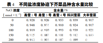 從表 4 可以看出,當鹽濃度為 50 mmol·L-1 時,5 個品種的含水量都在 90%以上; 當鹽濃度為100 mmol·L-1 時,除甬雪 4 號以外,其余 4 個品種 的含水量都在 90%以上; 當鹽濃度為 150 mmol·L-1 時,甬雪 3 號和大豐雪菜的含水量降至 90%以下, 其余 3 個品種仍在 90%以上; 當鹽濃度升高至 200 mmol·L-1 時,甬雪 4 號和科興雪菜的含水量降至 90%以下,而甬雪 1 號和甬雪 3 號的含水量仍在 90%以上。