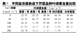 從表 5 可看出,當鹽濃度≤150 mmol·L-1 時, 鹽脅迫對甬雪 1 號葉綠素含量的影響不是很大; 當 鹽濃度升至 200 mmol·L-1 時,甬雪 1 號的葉綠素 含量明顯降低。隨著鹽濃度的升高,甬雪 3 號的葉 綠素含量呈現微小的 2 次先升高再降低的趨勢; 鹽 濃度對甬雪 4 號葉綠素含量的影響表現為負相關; 而科興雪菜與大豐雪菜在不同鹽濃度的脅迫下其葉 綠素含量呈先上升后下降的趨勢,峰值分別出現在 150 和 50 mmol·L-1 鹽脅迫時。