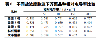 從表 6 可知,5 個品種中,甬雪 4 號、科興雪 菜和大豐雪菜的相對電導率基本隨著鹽濃度的上升 呈上升趨勢; 甬雪 1 號和甬雪 3 號相對電導率的峰 值均出現在 100 mmol·L-1 鹽脅迫。